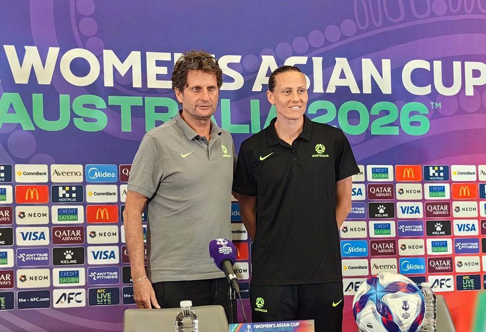 北京时间3月16日,女足亚洲杯半决赛中国vs澳大利亚的赛前新闻发布会在珀斯体育场进行。澳大利亚队主教练蒙特穆罗携队员范埃赫蒙德出席。